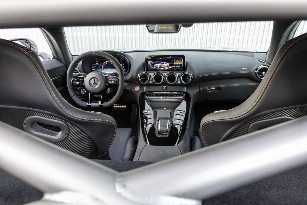 El interior contiene elementos racing como una jaula anti vuelco, un volante AMG de alcántara, unos asientos tipo “bucket” o un dial amarillo para ajustar el control de tracción que te harán sentir como en un coche de carreras, al mismo tiempo tiene dos pantallas que te permiten seleccionar tanto la información mostrada en el cuadro de instrumentos digital como en una pantalla situada en el centro del salpicadero, gracias al menú especial de AMG esta segunda pantalla permite mostrar información más detallada al igual que guardar circuitos y cronometrar vueltas en ellos.
